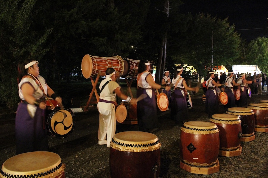 さて、いよいよスペシャルゲスト、帯広市郷土芸能「帯広平原太鼓」の演奏です。で、調べてみると、団体の発足が1970(昭和45)年と、栗山みのり太鼓と同じ! 半世紀以上、文字どおり十勝の平原に太鼓の音を響かせてきています。毎年、8月15日に行われる、「帯広平原まつり」の太鼓まつりに呼んでいただき、全道20チームほどと一緒に楽しく、刺激的な時間を過ごさせていただいています。ありがとうございます! 今回は「祝太鼓」、「祭礼」の2曲を演奏いただきました。